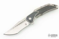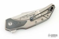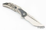This Astio by Begg Knives is a JVO design, it features a mirror polished tanto recurve blade with fullers and satin flats. The handle has a satin finished titanium frame with carbo quartz inlays, cracked iced DLC coated titanium backspacer and tip up clip with ceramic ball, jewel iced titanium pivot collars. Rides on ceramic IKBS, nice detent, lockup and blade seating. Has a ceramic detent ball. Comes with zippered case. Excellent condition.