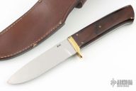 This hunter by Ralph Bone features a mirror finished blade with a notched thumbrest, .168" blade stock and 1.087" blade depth, full tang construction. The handle has a brass guard, rosewood scales. Comes with a brown leather sheath, not original, but fits nicely. Stamped "FT329". Excellent condition.