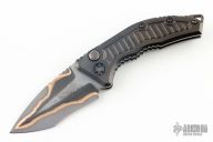 This Medusa by Heretic Knives features a Baker Forge Damascus recurve blade with a notched thumbrest.  The handle features a DLC coated frag pattern frame with a matching backspacer.  The push button and titanium tip up pocket clip both have a Snakeskin Fat Carbon inlay. Comes with a zipper case. Excellent Condition.