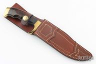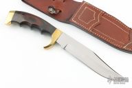 This bowie by Kershaw features a mirror polished blade with false top edge, .206" blade stock and 1.164" blade depth, hidden tang construction. The handle has a brass guard and butt with dymondwood grip. Comes with original box, papers and brown leather sheath. Excellent condition. #1637