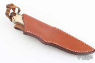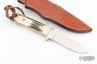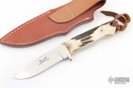 This knife from Rigid Knives features mirror finished blade, .155" blade stock and 1.027" blade depth, full tapered tang construction. The handle has a nickel silver guard with stag scales over red liners. Comes with original brown leather sheath and box. Excellent condition.