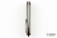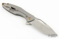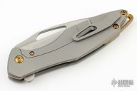 This Arius by Koenig knives features a two-tone blade with thumbhole and flipper. The handle has a nicely milled titanium frame with a titanium tip up clip, anodized titanium backspacer. Has ceramic bearings and a ceramic detent ball. Nice detent, lockup and blade seating. Comes with a zipper case.