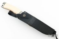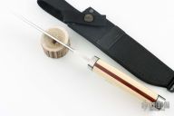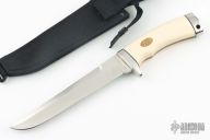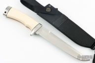 This fixed blade by Katz Knives features a satin finish blade with false top edge, .198" blade stock, 1.106" blade depth, hidden tang construction. The handle has a stainless steel guard and butt, ivory paper micarta scales with black spacers and a dymondwood frame. Includes nylon sheath and original box and papers. Excellent condition.