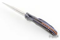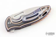 This Sentry framelock flipper by Korth Cutlery features a hand rub satin finished blade with notched thumbrest, thumb hole and flipper. The handle features an orange peel and anodize finished titanium frame with copper inlays that have lightning strike carbon fiber inlays, sculpted copper backspacer and a tip up titanium clip. Includes IKBS (Ikoma-Korth Bearing System) for smooth and fast opening that requires no wrist action. Nice blade seating, detent, and lockup. Outstanding work with great attention to detail. Comes with zippered case. Has a few light scratches, and the tip is rolled very slightly, otherwise excellent condition.