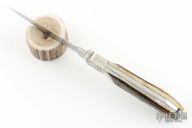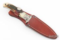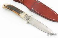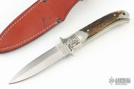 This dagger by Taylor Cutlery features a satin finished double edged blade with .158" blade stock and .999" blade depth, full tang construction. The handle has engraved nickel silver bolsters, stag jigged bone scales and a lanyard hole. Comes with a brown leather sheath with boot clip. Comes with original box. Excellent condition.