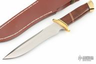 This knife by LC Smith features a satin finished blade with false top edge, .234" blade stock and 1.320" blade depth, hidden tang construction. The handle has a brass guard and butt, cocobolo grip with red/white/black/brass spacers. Comes with a brown leather sheath and original box. Excellent condition.