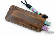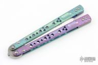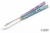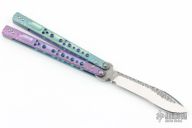 This Palethius Designs Balisong has a satin finished blade with carved flats. The handles are milled, carved and anodized titanium with matching spacers.  Includes the original box, leather slip sheath and a titanium bead.  Has a Pocket Hanks Joker padded mat.  #1120.  Excellent Condition.