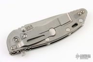 This Skinny XM-18 3.5" flipper by Rick Hinderer features a stonewashed blade with notched thumbrest and flipper. The handle has a stonewashed titanium frame with a textured titanium scale, a tip up or down reversible titanium clip and filler tab, lanyard hole at the butt. Comes with original box, extra washers, and original blue g10 scale with Ti liner. Excellent condition.
