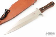 This Alaskan Bowie by Al Mar features a satin finished clip point blade with a false top edge, .225" blade stock and 2.100" blade depth, full tang construction. The handle has a stainless steel guard, and wood scales. Comes with a brown leather sheath. Has some very light scratches, otherwise excellent condition.