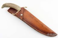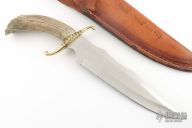 This Bowie by Pete Dunham features a satin finished blade with a false top edge, .187" blade stock and 2.366" blade depth, hidden tang construction. The handle has a fileworked brass guard and crown caribou antler grip. Comes with a hand tooled brown leather sheath. Has a few light scratches, otherwise excellent condition.