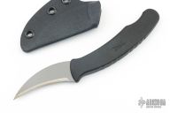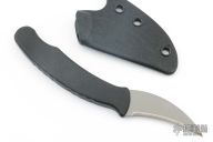 This L-via by Kopis Design features a bead blast and tumble finish hawkbill blade with .061" blade stock and .784" blade depth, hidden tang construction. The handle is glass filled nylon. Comes with a kydex sheath and original box. New condition.