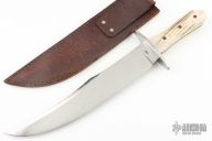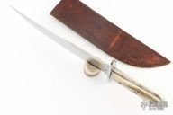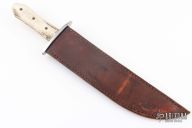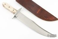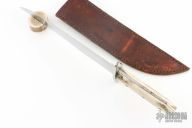 This Bowie by Steve Brooks features a satin finished clip point blade with sharpened clip, .224" blade stock and 2.043" blade depth, full tapered tang construction. The handle has a steel guard and stag scales with brass pins. Includes a brown leather sheath with belt loop. Has some scratches and oxidation spots, otherwise good condition.