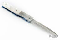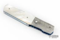 This Side Opening Auto by Reese Weiland features a Damascus dagger shape blade. The handle has matching Damascus bolsters, MOP scales, anodized and jeweled titanium liners, and a Titanium backspacer with MOP inlay. Mother of pearl inset push button. Nice detent lockup and blade seating. "RW Prototype" inside backspacer. Nice action. Comes with zippered case. Excellent condition.