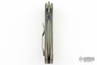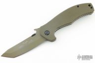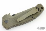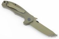 This Mini Roadhouse by Emerson has a green tanto blade with a standard edge, thumbdisc and wave feature. #0002 on blade. The handle has OD Green G-10 scales, titanium liners and an OD Green tip up clip. Nice detent, lockup and blade seating. Excellent condition. Comes with original box and papers.
