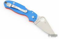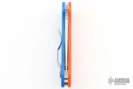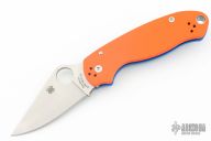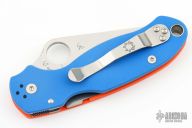 This Para 3 by Spyderco features a satin finished clip point REX45 blade with thumb hole and notched thumbrest. The handle is comprised of an orange and blue G-10 frame over nested steel liner and stand offs. The steel pocket clip is 4 way adjustable. Includes original box and paperwork. New condition. Cutlery Shoppe Exclusive