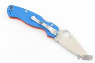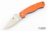 This Para 2 by Spyderco features a satin finished clip point REX45 blade with thumb hole and notched thumbrest. The handle is comprised of an orange and blue G-10 frame over nested steel liner and stand offs. The steel pocket clip is 4 way adjustable. Includes original box and paperwork. New condition.