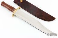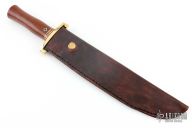 This Randall Style Bowie by RBH Custom Knives features a satin finished blade with a sharpened top edge, .202" blade stock and 2.093" blade depth, hidden tang construction. The handle has a lugged brass guard, brown canvas micarta grip with red/brass spacers, brass butt. Comes with a brown leather sheath with belt stud. Excellent condition.