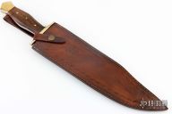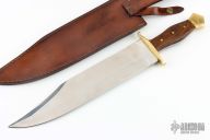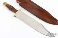 This bowie features a mirror polished blade with false top edge, .199" blade stock and 2.318" blade depth, full tang construction. The handle has a brass guard and rear bolsters, wood scales with brass pins. Comes with a brown leather sheath. Has a few light scratches, otherwise excellent condition.