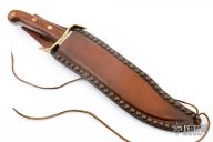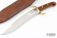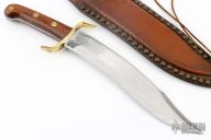 This knife by Ames Manufacturing features a mirror polished blade with sharpened top edge, .213" blade stock and 1.735" blade depth, full tang construction. The handle has a brass guard with wood scales and brass pins. Comes with brown leather sheath with brass studs. Has some scratches and oxidation, otherwise good condition for its age. Dated 1862 on the blade.
