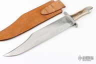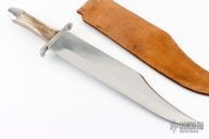 This knife by AM Maddux features a satin finished blade with nearly sharpened top edge, .251" blade stock and 2.542" blade depth, full tang construction. The handle has a steel guard with elk scales, red liners, dovetailed steel rear bolsters. Comes with brown leather sheath. Has some light scratches, otherwise excellent condition.