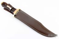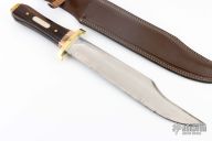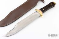 This bowie by Joel Rouse features a satin finished blade with a false top edge, .232" blade stock and 2.328" blade depth, hidden tang construction. The handle has a brass guard and fileworked collar, rosewood grip with brass pins and a mammoth ivory escutcheon, brass butt cap. Comes with a brown leather sheath. Has some oxidation and scratches, otherwise good condition.