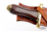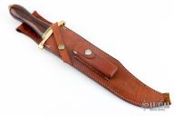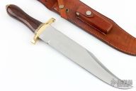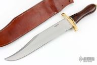 This Bowie by John Carson features a clip point satin finished blade with sharpened top edge, .233" blade stock and 1.964" blade depth, hidden tang construction. The handle has a brass guard and butt with ironwood grip and black/brass spacers. Comes with a brown leather sheath. Has some light patina/oxidation, otherwise good condition.