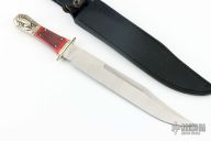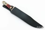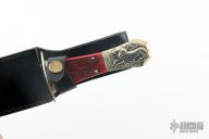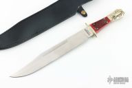 This bowie by Schrade Cutlery features a satin finished blade with false top edge, .192" blade stock and 1.504" blade depth, full tang construction. The handle has a nickel silver guard and rear bolsters with red jigged bone scales with black liners. Comes with a black leather sheath. Has a few light scratches, otherwise excellent condition.