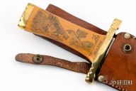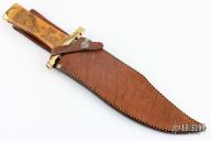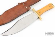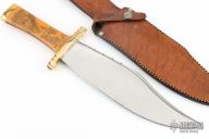 This bowie by Frank Nolton features a mirror polished blade with a nearly sharpened top edge and a fileworked spine, .162" blade stock and 2.656" blade depth, hidden tang construction. The handle has a fileworked brass guard, Westinghouse paper micarta scales with a black frame and a fileworked brass butt. Scrimshaw on the handle by the maker. Comes with a brown leather sheath. Has some oxidation and scratches, otherwise good condition.