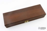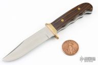 This "Spirit of 76" commemorative knife by Buck features a polished clip point blade with swedge. The handle is comprised of a brass guard and pins with wood scales over full tang construction. The blade has been etched with a scene depicting the Founding Fathers, Paul Revere, The Liberty bell and an Bald Eagle. Medallion inlay on the "B" side of the handle. Number 2639 of 7600. Includes wooden display box and coin. Some light marks on blade but overall great condition.