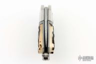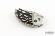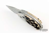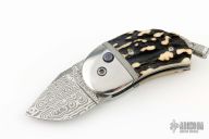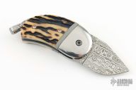 This Model 13 Minnow by Phil Booth features a AEGIR pattern Damasteel blade. The handle has stainless steel dovetailed bolsters, stag scales, bead blasted stainless steel liners, matching Damasteel backspacer and lanyard bail, blued steel push button. Nice lockup, action and blade seating. Comes with a zippered case. Excellent condition.