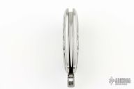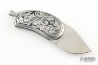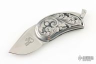 This Model 13 Minnow by Phil Booth features a hand rub satin finished blade. The handle has engraved stainelss steel scales, engraving by Kim Cover, stainless steel backspacer and lanyard bail, steel push button. Nice action and blade seating. Comes with a zippered case. Excellent condition.