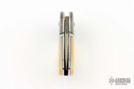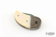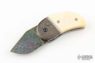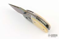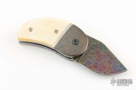 This Model 13 Minnow by Phil Booth features a Bertie Rietveld Dragonskin Damascus blade. The handle has matching Damascus dovetailed bolsters, gold lip pearl scales, stainless steel liners, matching Damascus backspacer, blued steel push button. Nice lockup, action and blade seating. Comes with a zippered case. Excellent condition.