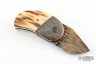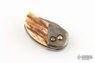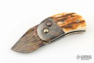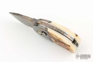 This Model 13 Minnow by Phil Booth features a Doug Ponzio Damascus blade. The handle has matching Damascus dovetailed bolsters, mammoth ivory scales, stainless steel liners, matching Damascus backspacer, blued steel push button. Nice lockup, action and blade seating. Comes with a zippered case. Excellent condition.