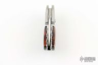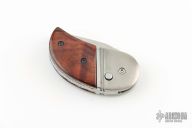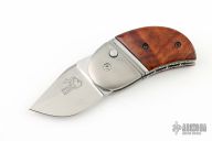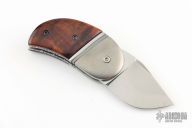 This Model 13 Minnow by Phil Booth features a hand rub satin finished blade. The handle has orange peel finished dovetailed titanium bolsters, curly koa wood scales, integral fileworked titanium liners, stainless steel backspacer, steel push button. Nice action and blade seating. Comes with a zippered case. Excellent condition.