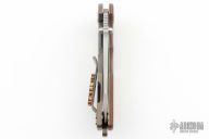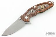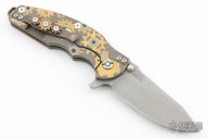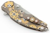 This Jurassic by Hinderer Knives features a stonewash finished blade with notched thumbrest and flipper. The handle has a black/orange G-10 scale with brass gears inside the scale and milled gear pattern on the liner, black titanium liner and frame with laser engraved gear pattern, tip up or down reversible anodized titanium clip and filler tab, clip has three brass gears. Nice detent, lockup and blade seating. Comes with original box and card. Has a couple light scuffs, otherwise Excellent condition.