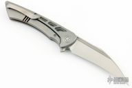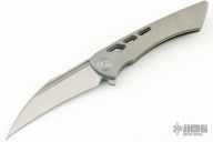 This Derecho Flipper from Brian Nadeau features a satin finished blade with a flipper, fullers and notched thumbrest. The handle has an "Aspirated" bead blasted titanium frame with a satin titanium tip up clip with hidden screws. Rides on bearings, nice detent, lockup and blade seating, stainless lockface insert. Comes with original box. New from maker.