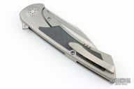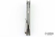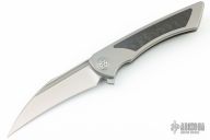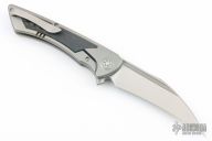 This Derecho Flipper from Brian Nadeau features a satin finished blade with a flipper, fullers and notched thumbrest. The handle has a bead blasted titanium frame with carbon fiber inlays, a satin titanium tip up clip with hidden screws. Rides on bearings, nice detent, lockup and blade seating, stainless lockface insert. Comes with original box. New from maker.