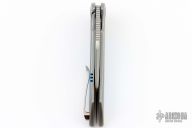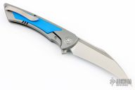 This Derecho Flipper from Brian Nadeau features a satin finished blade with a flipper, fullers and notched thumbrest. The handle has a bead blasted titanium frame with blue G-10 inlays, a satin titanium tip up clip with hidden screws. Rides on bearings, nice detent, lockup and blade seating, stainless lockface insert. Comes with original box. New from maker.