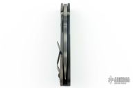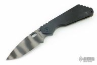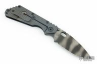 This Mick Strider SMF Fatty framelock folder features a bead blast finished tiger striped blade with thumbhole and notched thumbrest. The handle has a black aluminum and flamed titanium frame with titanium clip, tip up custom deep carry pocket clip. Jimping on blade spine. Nice lockup, detent, and blade seating. Has some light scuffs and scratches, great condition otherwise.