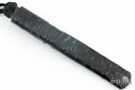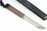 This is kozuka by Phill Hartsfield has a chisel ground tanto blade with .118" blade stock and .740" blade depth, hidden tang construction. The handle has a copper wrap. Includes the original paper lined, leather covered metal sheath with clip. Excellent Condition.