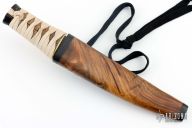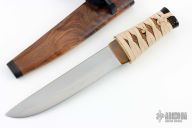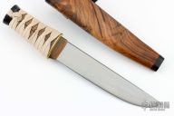 This Hocho Tanto by Kaji Customs features a hand rub satin finished blade with hamon, .248" blade stock and 1.469" blade depth, hidden tang construction. The handle has a copper habiki, brass fuchi, suede leather tsuka-ito over ray skin same. Comes with a walnut burl wood saya with a wood Kashira. New from maker.