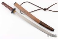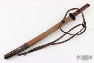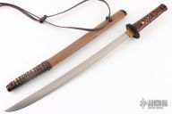 This Wakizashi by Kaji Customs features a hand rub satin finished blade with hamon, .184" blade stock and 1.011" blade depth, hidden tang construction. The handle has a copper habiki and seppas, iron tsuba, brown leather tsuka-ito with walnut same. Comes with a a walnut wood saya with a horn Kashira. New from maker.