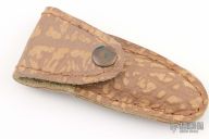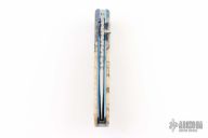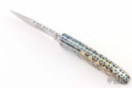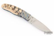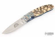 This Linerlock by Sidney "Pete" Moon features a hand rub satin finished blade with single thumbstud and fileworked blade spine. The handle has colored mosaic Damascus dovetailed bolsters, coral scales, anodized and fileworked titanium liners and backspacer. Nice detent, lockup and blade seating. Has a few light scratches, otherwise excellent condition. "S# 082" on blade. Comes with a brown leather sheath.