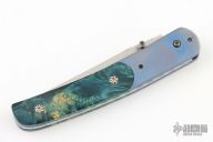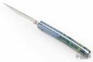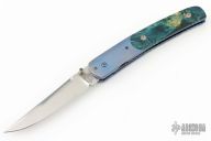 This knife by Doc Hagen features a hand rub satin finished blade with fileworked spine and single fileworked thumbstud with blue stone inlay. The handle has anodized titanium bolsters, box elder burl scales, fileworked titanium liners, and a fileworked stainless steel backspacer. Has some light scratches, otherwise good condition.