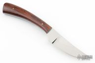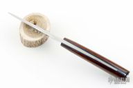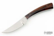 This knife by Gene White features a polish finished blade with .182" blade stock and .862" blade depth, full tapered tang construction. The handle has pinned wood scales with blue liners. Has a couple light scuffs, excellent condition.
