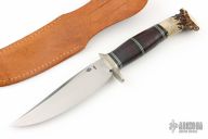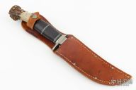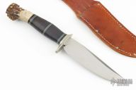 This Scagel Style Hunter by Master Smith P.J. Tomes features a hand rub satin finished blade with false top edge, .134" blade stock, 1.216" blade depth, hidden tang construction. The handle has a nickel silver guard, stacked leather grip with black and nickel silver spacers, and a stag pommel. Excellent condition. Comes with a brown leather sheath. This is a very early mark for PJ Tomes that he hasn't used in over 30 years.