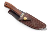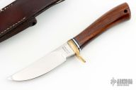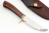 This custom skinner by Harvey Draper features a mirror polished blade with .178" blade stock and .919" blade depth, hidden tang construction. The handle has a brass guard and cocobolo grip with black/aluminum spacers. Comes with a hand tooled brown leather sheath. Excellent condition.