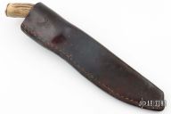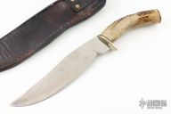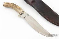 This Camp Knife by Irvin Campbell features a mirror polished blade with visible temper line, .232" blade stock and 1.690" blade depth, hidden tang construction. The handle has a nickel silver guard and butt, stag grip with red/brass spacers. Comes with a brown leather sheath. Has some scratches and patina, otherwise good condition.