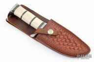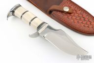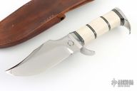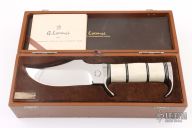 This Elmer Keith by DE Friedly features a mirror polished blade with a sharpened top edge and notched thumbrest, .370" blade stock and 1.733" blade depth, hidden tang construction. The handle has a stainless steel guard and butt, ground stag grip with black and nickel silver liners. Comes with a hand tooled brown leather sheath, a presentation box from the iconic G. Lorenzi cutlery boutique in Milan Italy (closed in 2014), and COA dated 1985. Comes with a hand tooled brown leather sheath. Excellent condition.