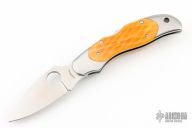 This lock back folding knife by Spyderco features a satin finish VG10 blade, and stainless steel double bolsters. Nice squash colored jigged bone scales. Stainless steel clip. Excellent condition. Includes original box and COA dated May 2009. One of 600